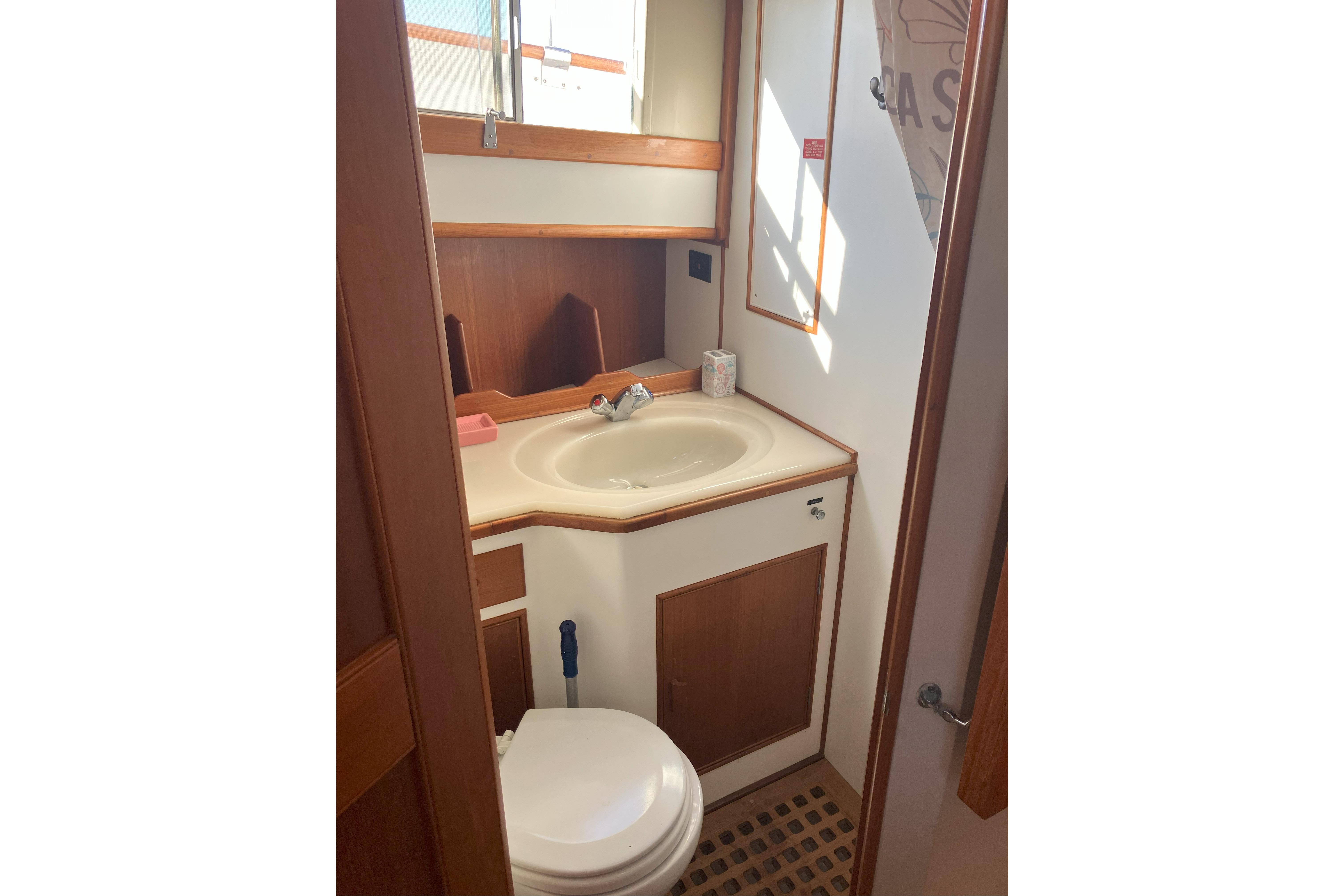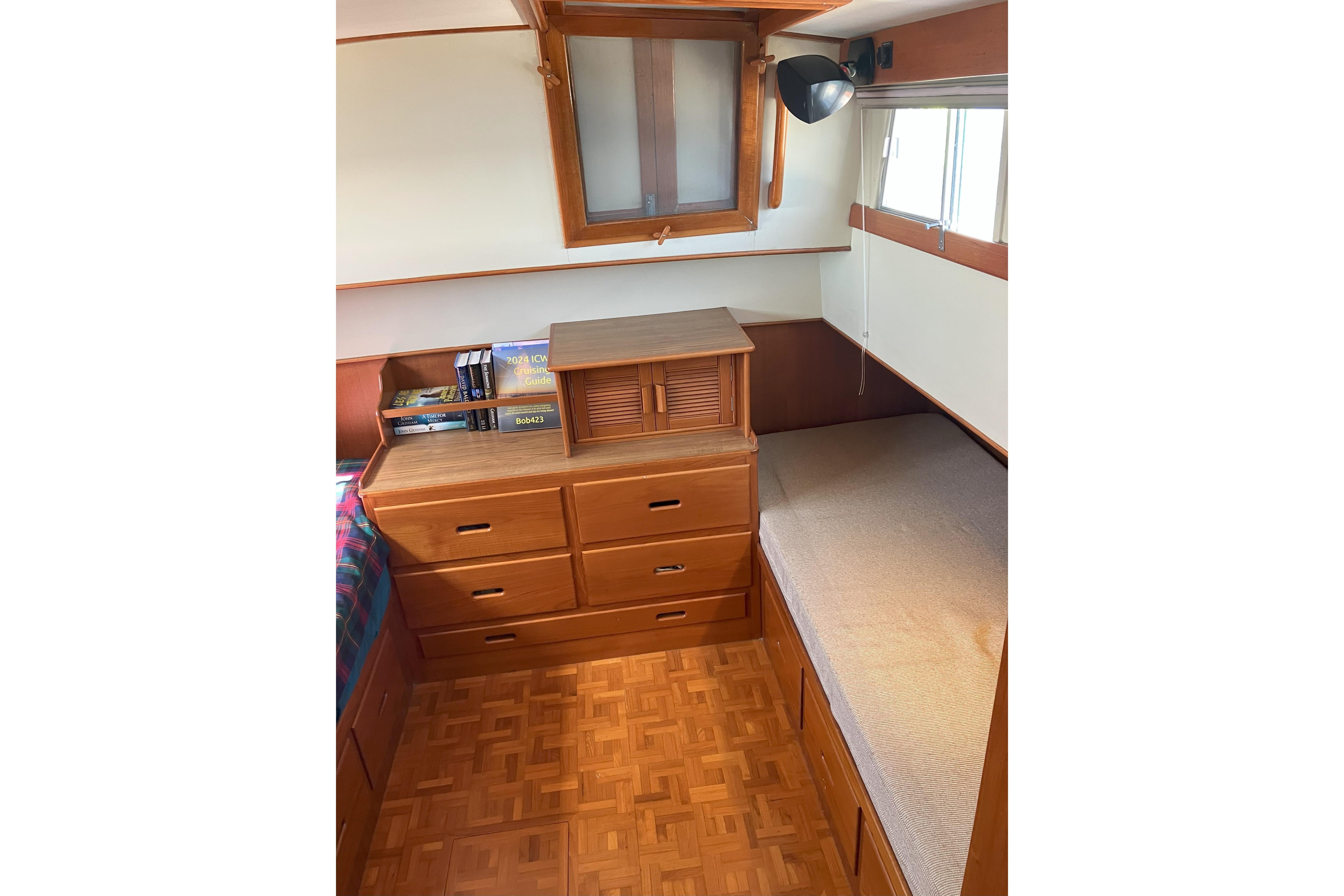 The private master stateroom is aft of the salon and has a double berth to starboard and a single berth to port and a hatch to access the aft deck. The stateroom includes private head, separate shower stall and sink. On the port side is a large hanging locker and storage lockers. There are storage drawers located below each berth.
